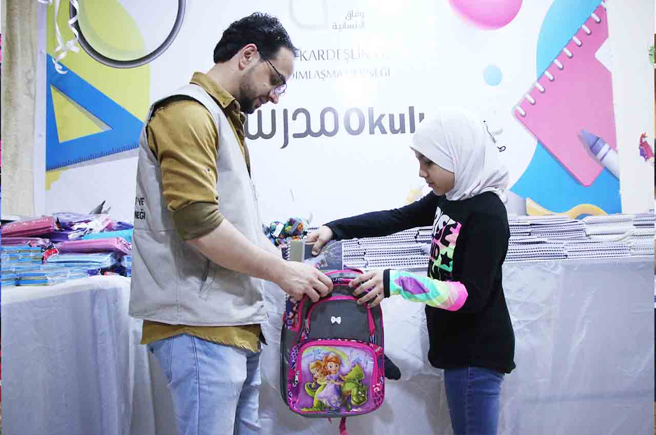 تهدف مؤسسة وفاق الإنسانية عن طريق مشروع توزيع حقائب مدرسية وقرطاسية على الأيتام الى تخفيف أعباء هذه الشريحة مع بداية كل عام دراسي حيث يعمل المشروع على تأمين كامل احتياجات الطلاب الأيتام من القرطاسية والمستلزمات المدرسية لتكفيهم عاماً كاملاً ويتم مراعاة تنوع الشريحة واختلاف الأعمار والصفوف الدراسية وبالتالي اختلاف مستلزماتهم.